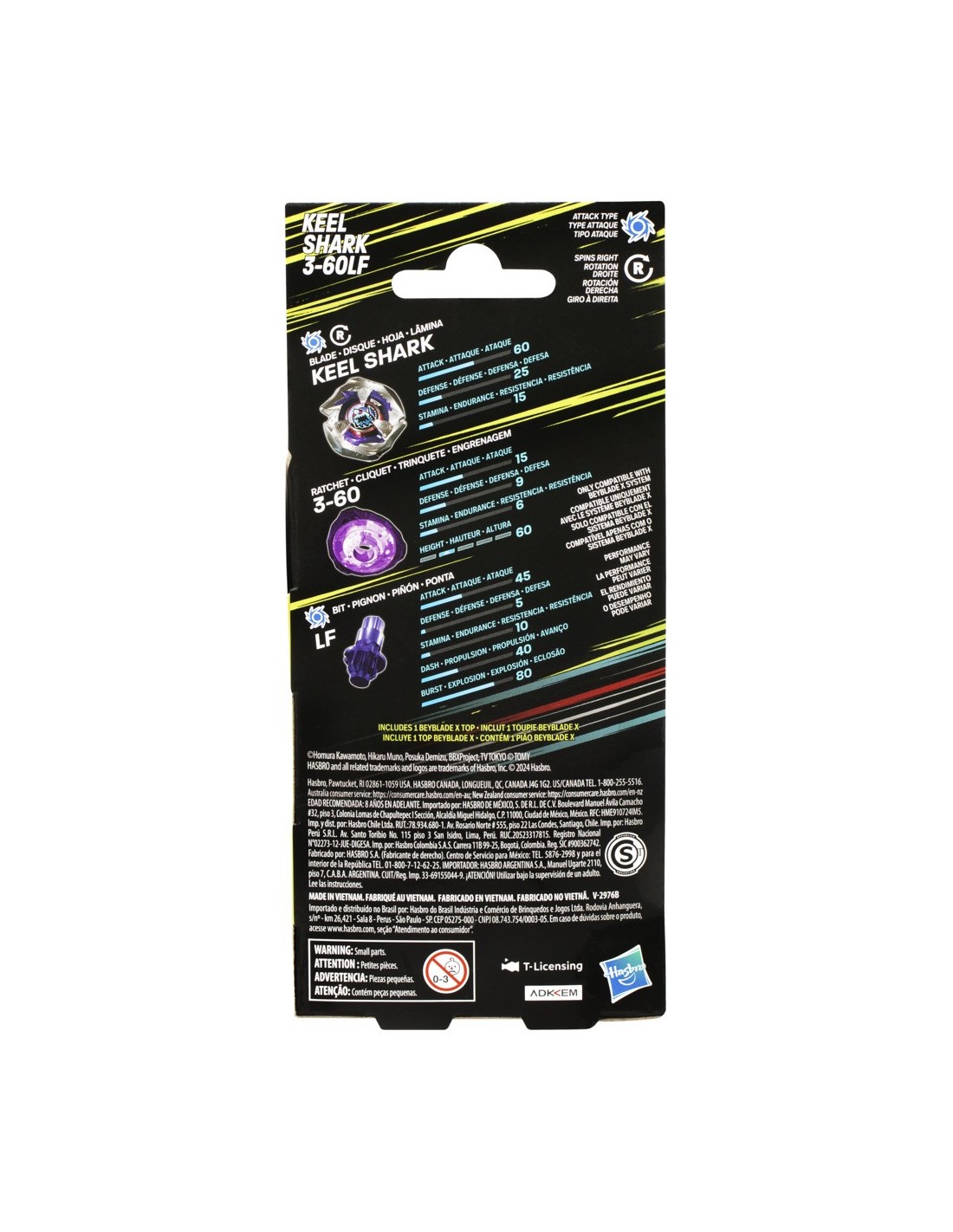 Vive la emoción de la próxima generación de arenas, lanzadores y tops Beyblade con el Kit de refuerzo Beyblade X Keel Shark 3-60LF, el cual incluye 1 top de rotación derecha y tipo ataque (Requiere Beystadium y lanzador se vende por separado). Lánzate a la batalla o reconfigura la hoja, el trinquete y el piñón intercambiables del top de este Kit de refuerzo con los otros tops Beyblade X (se venden por separado) para crear tu propio e imbatible top Beyblade. Beyblade X utiliza el nuevo Sistema de Aceleración X para llevar tu juego al siguiente nivel. Cuando el engranaje del top Beyblade X toca el riel del Beystadium, se puede propulsar a velocidades extremas alrededor de la arena para generar impresionantes choques y épicas explosiones. Los competidores lanzan sus tops a feroces batallas contra los tops de sus oponentes anotando puntos en cada confrontación.