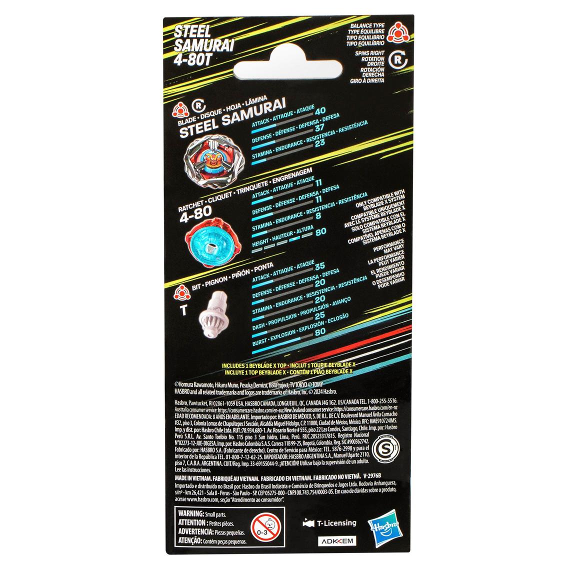 Vive la emoción de la próxima generación de arenas, lanzadores y tops Beyblade con el Kit de refuerzo Beyblade X Steel Samurai 4-80T, el cual incluye 1 top de rotación derecha y tipo equilibrio (Requiere Beystadium y lanzador se vende por separado). Lánzate a la batalla o reconfigura la hoja, el trinquete y el piñón intercambiables del top de este Kit de refuerzo con los otros tops Beyblade X (se venden por separado) para crear tu propio e imbatible top Beyblade. Beyblade X utiliza el nuevo Sistema de Aceleración X para llevar tu juego al siguiente nivel. Cuando el engranaje del top Beyblade X toca el riel del Beystadium, se puede propulsar a velocidades extremas alrededor de la arena para generar impresionantes choques y épicas explosiones. Los competidores lanzan sus tops a feroces batallas contra los tops de sus oponentes anotando puntos en cada confrontación.