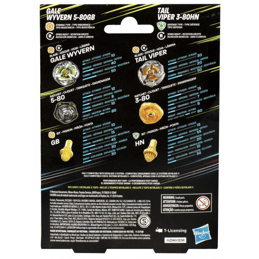 Vive la emoción de la próxima generación de arenas, lanzadores y tops Beyblade con el Pack doble Beyblade X Gale Wyvern 5-80GB y Tail Viper 3-80HN, el cual incluye 2 tops de rotación derecha (Requiere Beystadium y lanzadores. Se venden por separado). Lánzate a la batalla o reconfigura la hoja, el trinquete y el piñón intercambiables con los otros tops Beyblade X (se venden por separado) para crear tu propio e imbatible top Beyblade. Beyblade X utiliza el nuevo Sistema de Aceleración X para llevar tu juego al siguiente nivel. Cuando el engranaje del top Beyblade X toca el riel del Beystadium, se puede propulsar a velocidades extremas alrededor de la arena para generar impresionantes choques y épicas explosiones. Los competidores lanzan sus tops a feroces batallas contra los tops de sus oponentes anotando puntos en cada confrontación.
