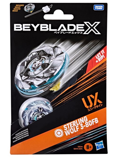 Vive la emoción de la próxima generación de arenas, lanzadores y tops Beyblade con el Kit Beyblade X: Sterling Wolf 3-80FB UX, el cual incluye 1 top de rotación derecha y tipo resistencia y un lanzador (Requiere Beystadium, se vende por separado). Lánzate a la batalla o reconfigura la hoja, el trinquete y el piñón intercambiables del top de este Kit con los otros tops Beyblade X (se venden por separado) para crear tu propio e imbatible top Beyblade