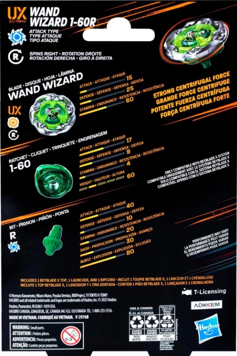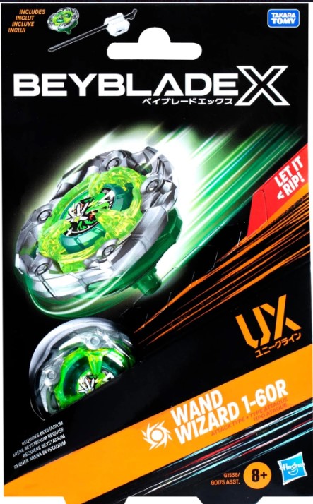 Vive la emoción de la próxima generación de arenas, lanzadores y tops Beyblade con el Kit Beyblade X: Wand Wizard 1-60R UX, el cual incluye 1 top de rotación derecha y tipo ataque y un lanzador (Requiere Beystadium, se vende por separado). Lánzate a la batalla o reconfigura la hoja, el trinquete y el piñón intercambiables del top de este Kit con los otros tops Beyblade X (se venden por separado) para crear tu propio e imbatible top Beyblade