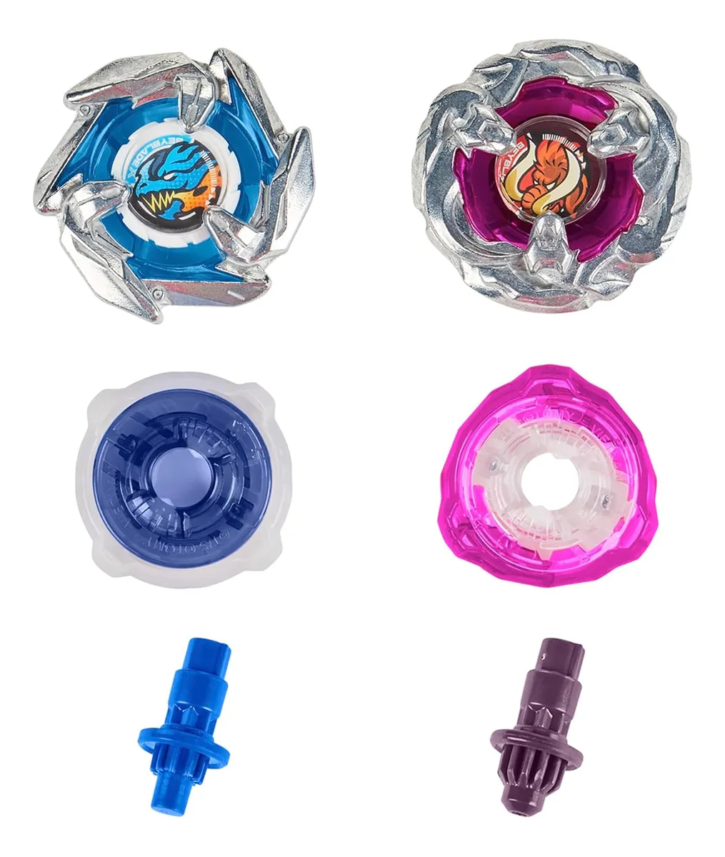 Usa los 2 lanzadores para desencadenar la furia de los tops Dagger Dran 4-60R de tipo ataque y Tusk Mammoth 3-60T de tipo equilibrio. Los competidores lanzan su top a feroces batallas contra el top de sus oponentes, anotando puntos en cada confrontación. El primero en anotar 4 puntos será el ganador.